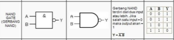 Gerbang NAND adalah kombinasi dari gerbang AND serta gerbang NOT. Yang mana telah menghasilkan kebalikan dari input atau keluaran gerbang AND.